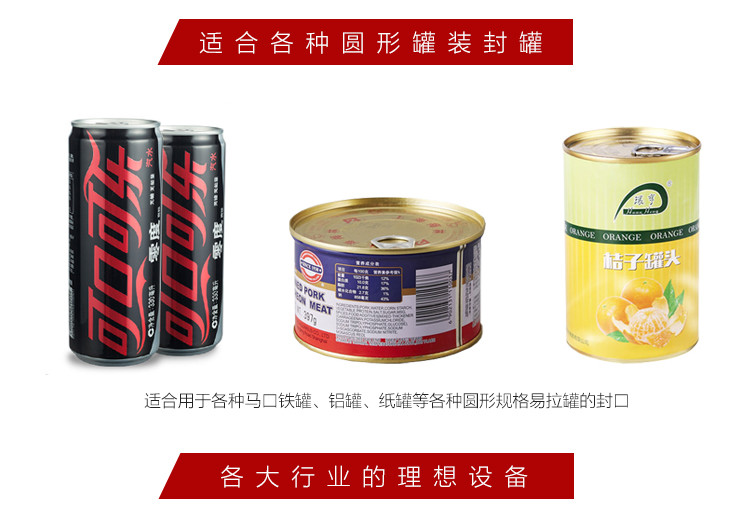 4、適用于各種馬口鐵罐、鋁合金罐、紙罐等各種圓形規(guī)格易拉罐的封口,操作簡單易學,是食品、飲料、制藥等行業(yè)的理想設備