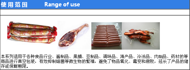該機適 用如:肉類加工、醬腌產(chǎn)品、水產(chǎn)、海產(chǎn)品加工、蔬菜加工、農(nóng)副產(chǎn)品加工、果脯、糧食、豆制品、藥材、電器、化學(xué)制品等顆粒、粉狀、液體等食品進行真空后充惰性氣體包裝、可以防止產(chǎn)品氧化霉變、腐敗、防潮達到延長產(chǎn)品的儲存期限。